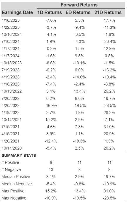 - There are 19 earnings data points recorded over the last five years, with 6 positive and 13 negative one-day (1D) returns observed. In summary, positive 1D returns were seen about 32% of the time.