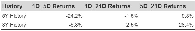 Additional data for observed 5-Day (5D), and 21-Day (21D) returns post earnings are summarized along with the statistics in the table below.