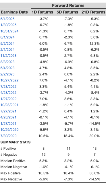 - There are 20 earnings data points recorded over the last five years, with 8 positive and 12 negative one-day (1D) returns observed. In summary, positive 1D returns were seen about 40% of the time.