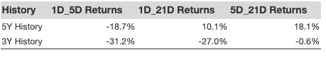 Additional data for observed 5-Day (5D), and 21-Day (21D) returns post earnings are summarized along with the statistics in the table below.