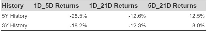 Additional data for observed 5-Day (5D) and 21-Day (21D) returns post earnings are summarized along with the statistics in the table below.