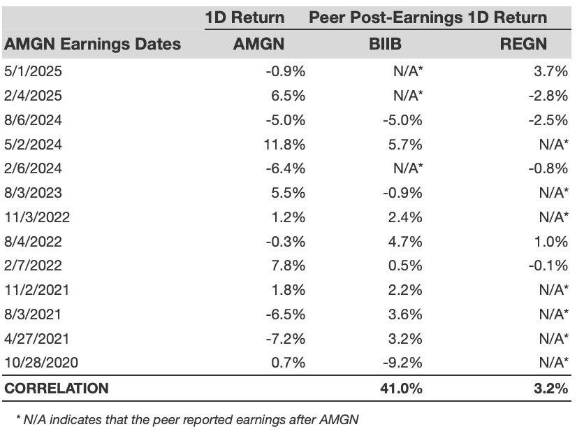 Sometimes, peer performance can have an influence on post-earnings stock reaction. In fact, the pricing-in might begin before the earnings are announced. Here is some historical data on the past post-earnings performance of Amgen stock compared with the stock performance of peers that reported earnings just before Amgen. For fair comparison, peer stock returns also represent post-earnings one-day (1D) returns.