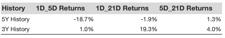 Additional data for observed 5-Day (5D) and 21-Day (21D) returns post earnings are summarized along with the statistics in the table below.