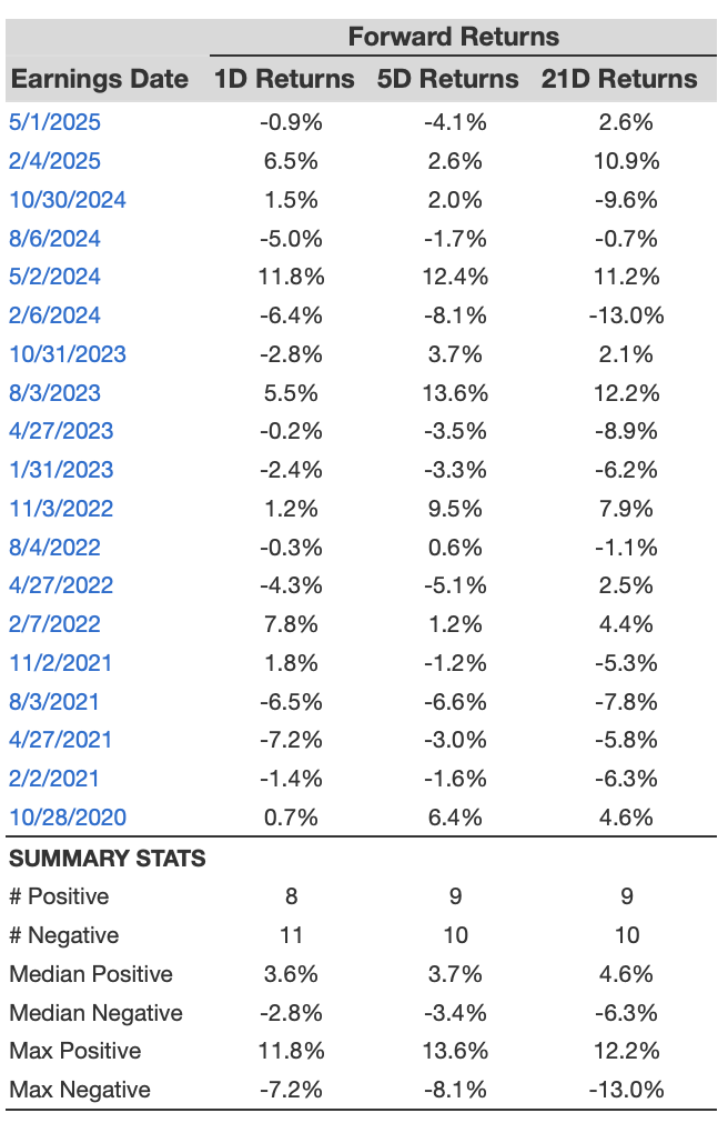 - There are 19 earnings data points recorded over the last five years, with 8 positive and 11 negative one-day (1D) returns observed. In summary, positive 1D returns were seen about 42% of the time.