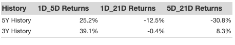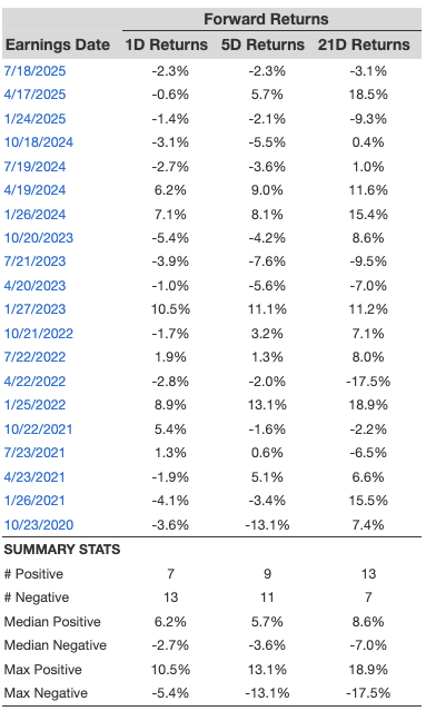 - There are 20 earnings data points recorded over the last five years, with 7 positive and 13 negative one-day (1D) returns observed. In summary, positive 1D returns were seen about 35% of the time.