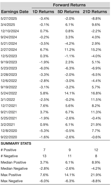 - There are 20 earnings data points recorded over the last five years, with 7 positive and 13 negative one-day (1D) returns observed. In summary, positive 1D returns were seen about 35% of the time.
