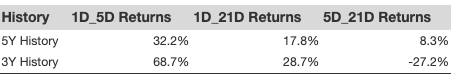 Additional data for observed 5-Day (5D) and 21-Day (21D) returns post earnings are summarized along with the statistics in the table below.