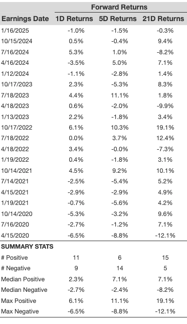 - There are 20 earnings data points recorded over the last five years, with 11 positive and 9 negative one-day (1D) returns observed. In summary, positive 1D returns were seen about 55% of the time.