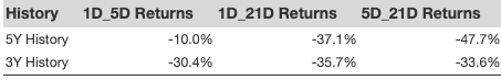 Additional data for observed 5-Day (5D), and 21-Day (21D) returns post earnings are summarized along with the statistics in the table below.