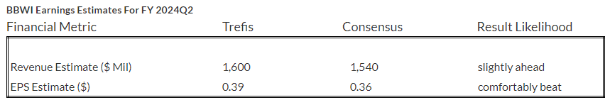 BBWI’s Q2 2024 EPS is expected to come in at 39 cents per Trefis analysis, higher than the consensus estimate. The company’s gross, operating, and net profits all increased, resulting in a respectable 9% profit growth y-o-y to $0.38.