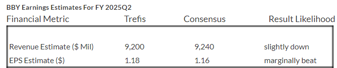 Trefis estimates Best Buy’s Q2 2025 revenues to be around $9.2 billion, slightly below the consensus estimate. In Q1, the electronics retailer posted $8.9 billion in revenue, down 6.5% y-o-y. The retailer saw its domestic comparable sales fall 6.3% during the quarter. The largest drivers of the comparable sales decline on a weighted basis were home theater, appliances, mobile phones, and gaming. International comparable sales dropped 3.3% during the quarter. We forecast Best Buy’s Revenues to be $41.9 billion for the full-year fiscal 2025, down 4% y-o-y.