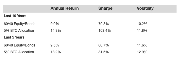 Let’s consider a portfolio that’s 60% equities and 40% bonds – using S&P 500 index fund and iShares Core U.S. Aggregate Bond ETF (AGG) as examples, and compare it with a portfolio that shifts 5% of the equity holding to bitcoin. And we consider both last 10 year and 5 year data, to understand if there is any shift in characteristics.