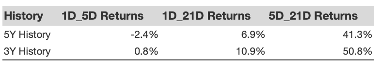 Additional data for observed 5-Day (5D), and 21-Day (21D) returns post earnings are summarized along with the statistics in the table below.