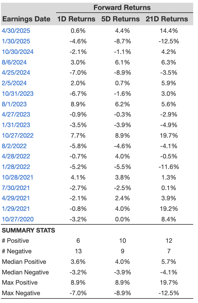 - There are 19 earnings data points recorded over the last five years, with 6 positive and 13 negative one-day (1D) returns observed. In summary, positive 1D returns were seen about 32% of the time.