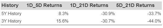 Additional data for observed 5-Day (5D), and 21-Day (21D) returns post earnings are summarized along with the statistics in the table below.