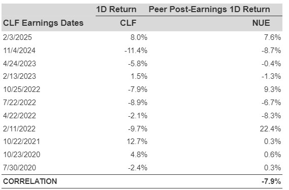 Sometimes, peer performance can have influence on post-earnings stock reaction. In fact, the pricing-in might begin before the earnings are announced. Here is some historical data on the past post-earnings performance of Cleveland-Cliffs stock compared with the stock performance of peers that reported earnings just before Cleveland-Cliffs. For fair comparison, peer stock returns also represent post-earnings one-day (1D) returns.