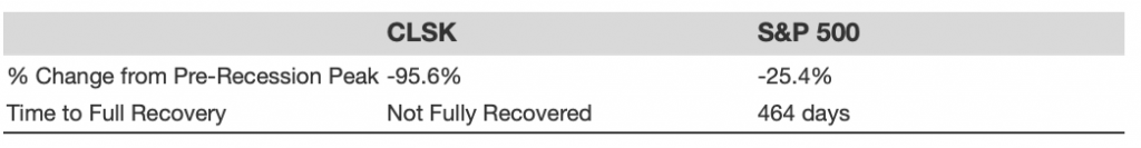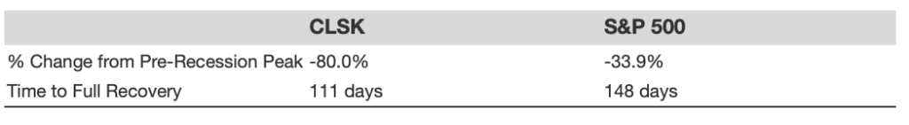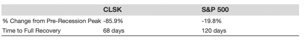 - CLSK stock fell 80.0% from a high of $5.25 on 23 January 2020 to $1.05 on 2 April 2020, vs. a peak-to-trough decline of 33.9% for the S&P 500.