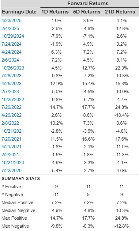 - There are 20 earnings data points recorded over the last five years, with 9 positive and 11 negative one-day (1D) returns observed. In summary, positive 1D returns were seen about 45% of the time.