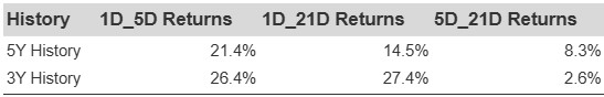 Additional data for observed 5-Day (5D), and 21-Day (21D) returns post earnings are summarized along with the statistics in the table below.