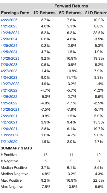 - There are 20 earnings data points recorded over the last five years, with 15 positive and 5 negative one-day (1D) returns observed. In summary, positive 1D returns were seen about 75% of the time.