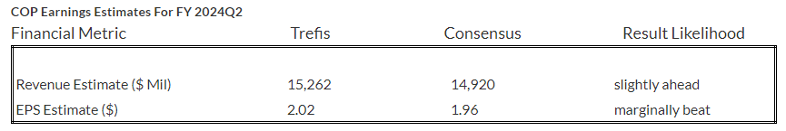 Trefis estimates COP’s Q2 2024 revenues to be around $15.3 Bil, marginally above the consensus estimate. In Q1, ConocoPhillips posted total revenue of $14.5 billion, down from the $15.5 billion made in the same quarter last year. Despite the reduced demand, total company production for the quarter rose to 1.9 mboed, up 6% y-o-y. Lower 48 production averaged 1.05 mboed with 736 mboed in the Permian, 197 mboed in the Eagle Ford, and 96 mboed in the Bakken. The Lower 48 comprises the three U.S. shale basins (Eagle Ford, Bakken, Permian Basin) and the Gulf of Mexico production, but not Alaska. Almost 55% of the total output comes from production in the Lower 48 of which 39% of the output comes from the Permian Basin itself.