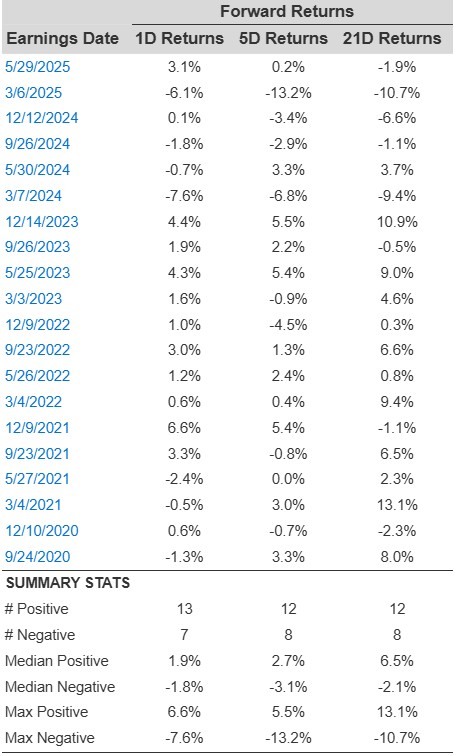 - There are 20 earnings data points recorded over the last five years, with 13 positive and 7 negative one-day (1D) returns observed. In summary, positive 1D returns were seen about 65% of the time.