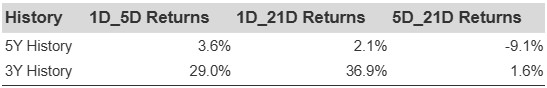 Additional data for observed 5-Day (5D) and 21-Day (21D) returns post earnings are summarized along with the statistics in the table below.