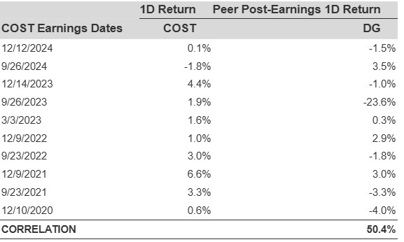 Sometimes, peer performance can have an influence on post-earnings stock reaction. In fact, the pricing-in might begin before the earnings are announced. Here is some historical data on the past post-earnings performance of Costco Wholesale stock compared with the stock performance of peers that reported earnings just before Costco Wholesale. For fair comparison, peer stock returns also represent post-earnings one-day (1D) returns.