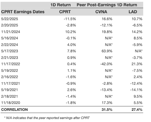 Sometimes, peer performance can have an influence on post-earnings stock reaction. In fact, the pricing-in might begin before the earnings are announced. Here is some historical data on the past post-earnings performance of Copart stock compared with the stock performance of peers that reported earnings just before Copart. For fair comparison, peer stock returns also represent post-earnings one-day (1D) returns.