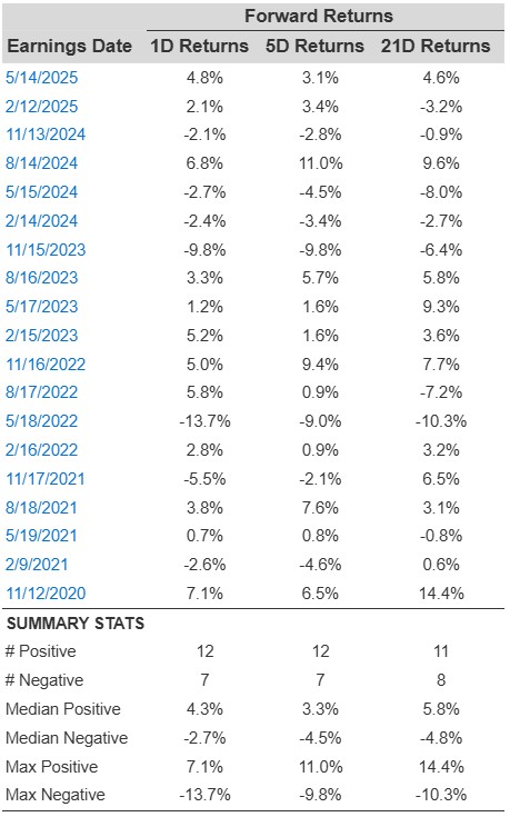 - There are 19 earnings data points recorded over the last five years, with 12 positive and 7 negative one-day (1D) returns observed. In summary, positive 1D returns were seen about 63% of the time.