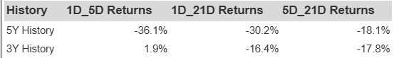 Additional data for observed 5-Day (5D) and 21-Day (21D) returns post earnings are summarized along with the statistics in the table below.
