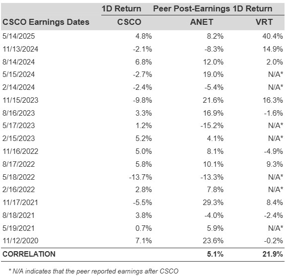 Sometimes, peer performance can have influence on post-earnings stock reaction. In fact, the pricing-in might begin before the earnings are announced. Here is some historical data on the past post-earnings performance of Cisco Systems stock compared with the stock performance of peers that reported earnings just before Cisco Systems. For fair comparison, peer stock returns also represent post-earnings one-day (1D) returns.