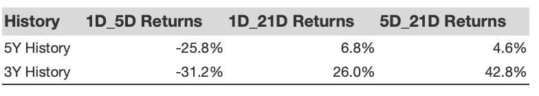 Additional data for observed 5-Day (5D), and 21-Day (21D) returns post earnings are summarized along with the statistics in the table below.