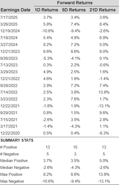 - There are 18 earnings data points recorded over the last five years, with 13 positive and 5 negative one-day (1D) returns observed. In summary, positive 1D returns were seen about 72% of the time.