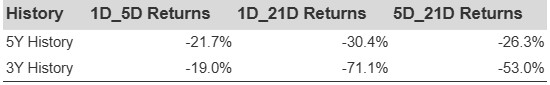 Additional data for observed 5-Day (5D) and 21-Day (21D) returns post earnings are summarized along with the statistics in the table below.