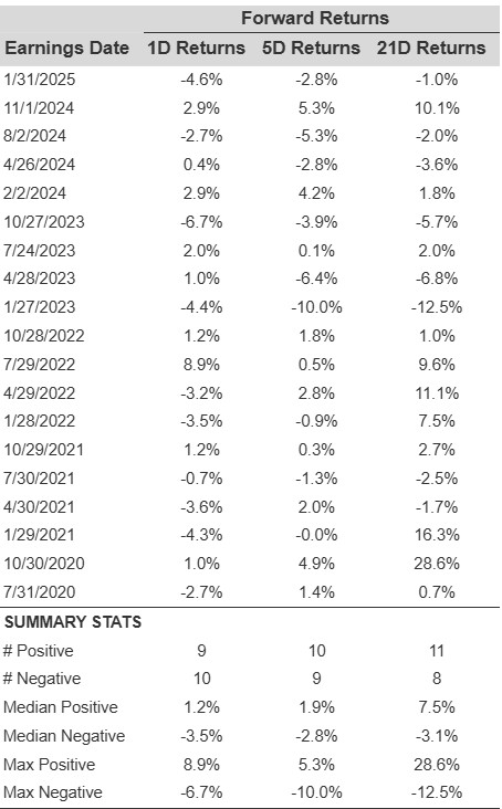 - There are 19 earnings data points recorded over the last five years, with 9 positive and 10 negative one-day (1D) returns observed. In summary, positive 1D returns were seen about 47% of the time.