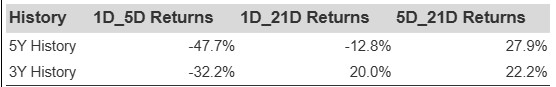 Additional data for observed 5-Day (5D), and 21-Day (21D) returns post earnings are summarized along with the statistics in the table below.
