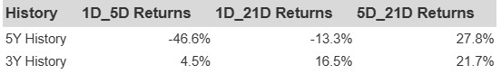 Additional data for observed 5-Day (5D), and 21-Day (21D) returns post earnings are summarized along with the statistics in the table below.