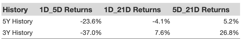- There are 20 earnings data points recorded over the last five years, with 7 positive and 13 negative one-day (1D) returns observed. In summary, positive 1D returns were seen about 35% of the time.