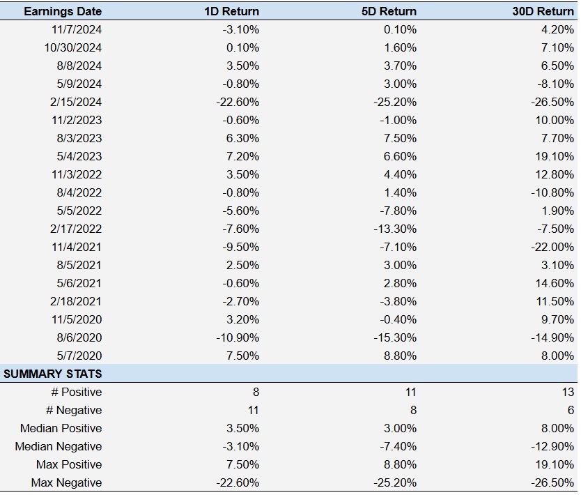 - In the past 5 years, 19 earnings data points recorded, with 8 positive and 11 negative one-day (1D) returns observed. In summary, positive 1D returns seen about 42% of the times.
