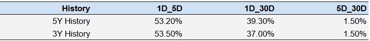 A relatively less risky strategy (though not useful if correlation is low) is to understand the correlation between short-term and medium-term returns post earnings, find a pair that has highest correlation and execute the appropriate trade. For example, if 1D and 5D show the highest correlation, a trader can position themselves “long” for the next 4 days if 1D post-earnings return is positive. Here is some correlation data based on 5-year and 3-year (more recent) history. Note that the correlation 1D_5D refers to correlation between 1D post-earnings returns and subsequent 5D returns.
