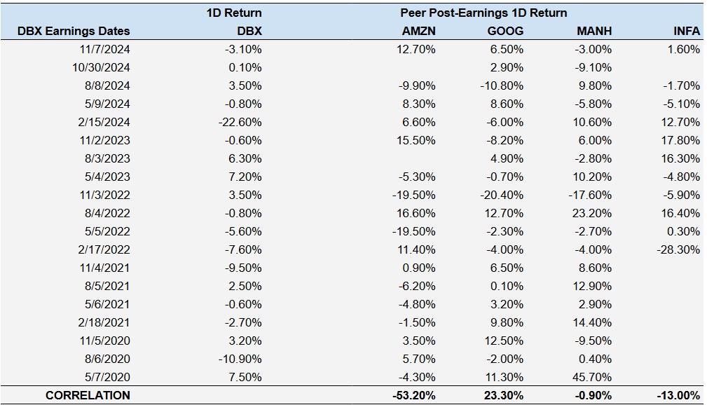 Sometimes, peer performance can have influence on post-earnings stock-reaction. In fact, the pricing-in might begin before the earnings are announced. Here is some historical data on past post-earnings performance of Dropbox stock compared with stock performance of peers that reported earnings just prior to Dropbox. For fair comparison, peer stock returns also represent post-earnings one day (1D) return.