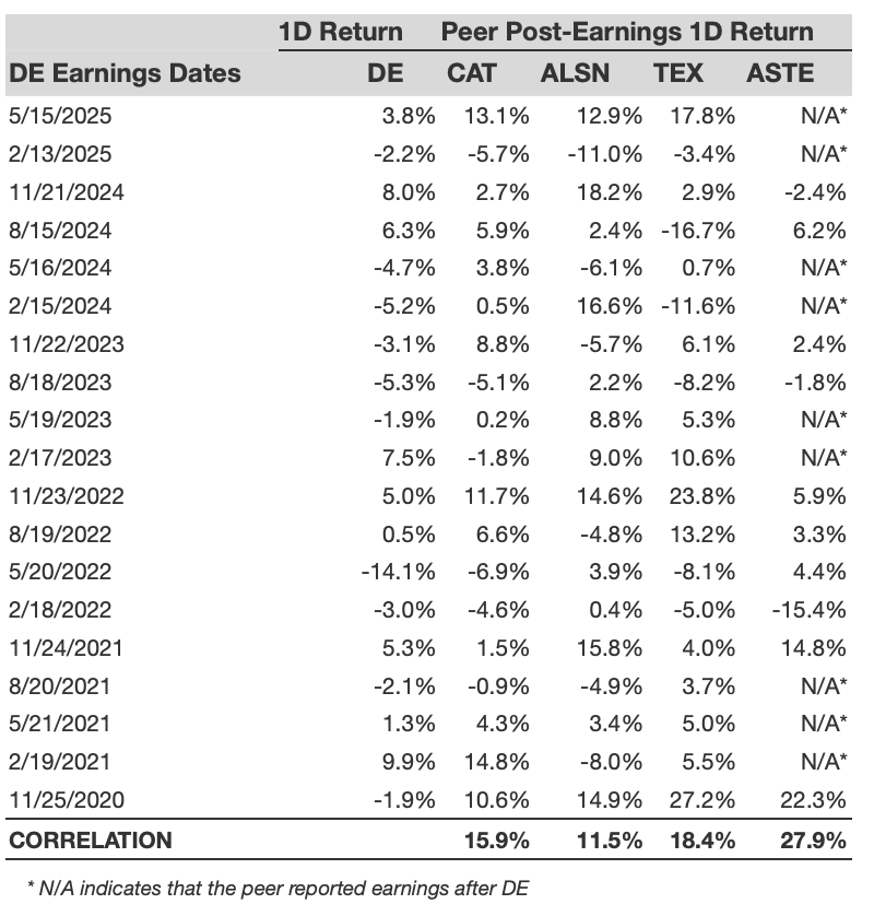 Sometimes, peer performance can have an influence on post-earnings stock reaction. In fact, the pricing-in might begin before the earnings are announced. Here is some historical data on the past post-earnings performance of Deere stock compared with the stock performance of peers that reported earnings just before Deere. For fair comparison, peer stock returns also represent post-earnings one-day (1D) returns. Also, see – Buy or Sell DE Stock?