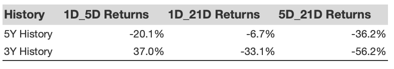 Additional data for observed 5-Day (5D) and 21-Day (21D) returns post earnings are summarized along with the statistics in the table below.