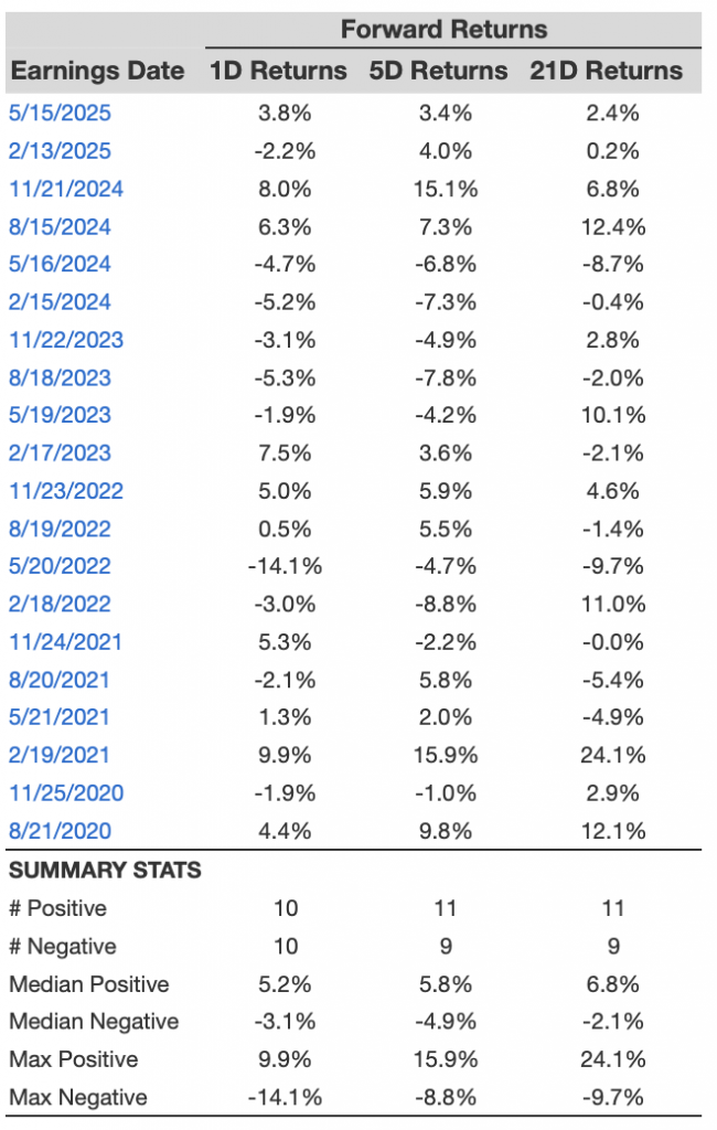 - There are 20 earnings data points recorded over the last five years, with 10 positive and 10 negative one-day (1D) returns observed. In summary, positive 1D returns were seen about 50% of the time.