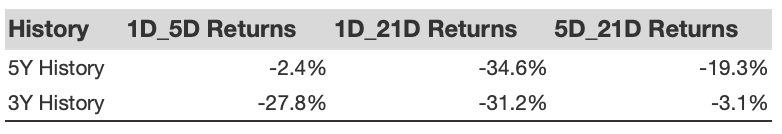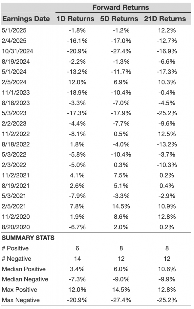 Over the past five years, the stock has shown a consistent pattern of negative one-day returns following its earnings announcements. Specifically, in 70% of these instances, the stock’s one-day return was negative. The median one-day drop was -7.3%, with the largest one-day decline being -20.9%. This historical trend suggests a tendency for the stock to fall on the day after the earnings report.