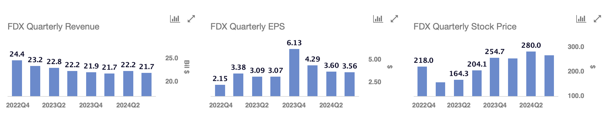 FedEx (NYSE: FDX) is scheduled to report its fiscal Q4 2024 results on Tuesday, June 25 (FedEx’s fiscal ends in May). We expect FDX stock to trade higher post the Q4 announcement, with its revenue and earnings expected to be above the street estimates. The company should continue to benefit from its cost reduction actions, while average daily volumes will likely stabilize. Not only do we think FedEx navigated well in Q4, we think its stock has ample room for growth from its current levels of around $250. Our interactive dashboard analysis of FedEx’s Earnings Preview has more details on how the company’s revenues and earnings will likely trend for the quarter. So, what are some trends likely to drive FedEx’s results, and how has the company’s stock performed?