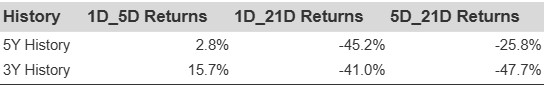 Additional data for observed 5-Day (5D), and 21-Day (21D) returns post earnings are summarized along with the statistics in the table below.