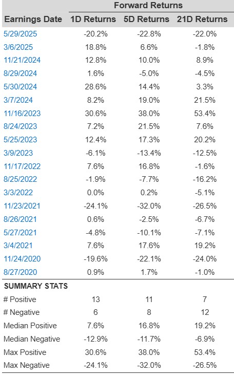 - There are 19 earnings data points recorded over the last five years, with 13 positive and 6 negative one-day (1D) returns observed. In summary, positive 1D returns were seen about 68% of the time.