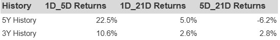 Additional data for observed 5-Day (5D) and 21-Day (21D) returns post earnings are summarized along with the statistics in the table below.